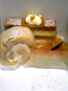 みためはおいしそーなケーキですが、手前左はじゃがいものロールケーキ、手前右は枝豆のホワイトショコラ、奥はとうもろこしのミルフィーユです。